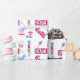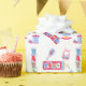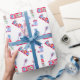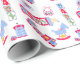 Colourful red, white, blue, yellow, and green baby boy's baby shower wrapping paper. Cute graphics of bottles, bibs, rocking horse, baby clothes, rattles, toy trains, and graphic text reading BABY.