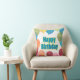 Happy Birthday! Give the birthday boy or girl a whimsical and fun birthday balloon pillow featuring our multi-colour balloons with our signature texture and he words, Happy Birthday in blue and green. Custom designs available.