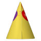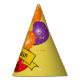 Colourful balloons with confetti are centred on this conical paper party hat with template text as part of the design over a yellow background. Fill in the template fields with your celebration and name, remove the name or click customise to select a typeface style, colour, and size you like.