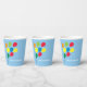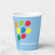 This festive boy's birthday party paper cup features a graphic of bold coloured balloons waving in the wind. The background is light blue which makes it perfect for a little boy's birthday.