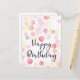 Colourful Happy Birthday Card with pink, purple, yellow, lilac balloons/bubbles. The 'happy birthday' font has pink shadow and pink dots that really make it pop! The back of the postcard has a pink border around the edge.