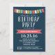 Send your guests this stylish birthday party invitation featuring a navy background with colourful bunting banners and modern typography. Be sure to check out all of the paper types available.