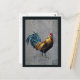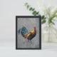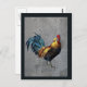 A colourful painting of a bantam rooster on a grey granite background. This rooster has exotic and colourful feather patterns. A bright red comb and a beautiful tail made of blue feathers.