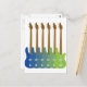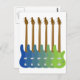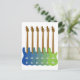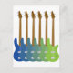 A colourful display of bass guitars, with variegated shades running from blue to green.