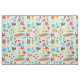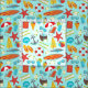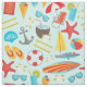 Graphics of beach vacation elements on a bright blue background, seamless repeat pattern