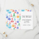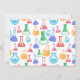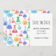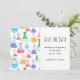 Save the date card with a fun and colourful pattern. Research scientist vibe with beakers and flasks of different shapes and sizes in bright happy colours.