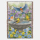 Bluebirds and goldfinches enjoying a fountain birdbath in a colourful spring flower garden of purple clematis clinging to a white picket fence, and yellow and blue daisies below. Artwork by wildlife and equine artist Crista S. Forest.