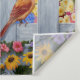 A beautifully painted scene of a variety of songbirds in a garden blooming with colourful spring flowers. Several species of birds sit on a white picket fence within the garden. Bird species include male and female American Goldfinches, an Eastern Bluebird, a Black-capped Chickadee, and a pair of male and female Northern Red Cardinals. Flower species included blue, purple, and yellow larkspur (delphinium), pink, red, and purple calibrachoa, and yellow-orange Black-Eyed Susan daisies. Realistic artwork created from an original oil painting by equine and wildlife artist Crista S. Forest.