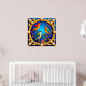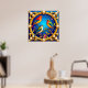 A view of three vibrantly coloured birds perched on branches, encased in an exquisitely decorated golden frame adorned with pearls and set against a vivid blue background. Elegance and nature blend beautifully.