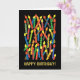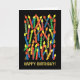A bright and colourful birthday card with candles on a black background, from a handpainted paper collage by Judy Adamson. Please contact me through my store if you would like the front cover text changed.