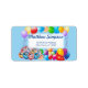 Elegant label feature cute, funny colourful, birthday party balloons on a blue background, with text in a white frame...Matthew Simpson...
