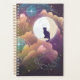 Sunset colours the surreal looking clouds in the sky in blue, purple, pink and yellow in this cute outer space illustration. A black cat sits on the crescent moon gazing out at the stars with fascination. Will she reach and try to grab one?