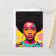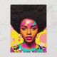 This pop art style artwork features a beautiful black woman with a large afro, 70s aesthetic with some flower power and hoop earrings. A vibrant melanin beauty with natural hair in a bold, multicolor digital art piece. Cyan, magenta pink, and yellow colour scheme with some peach.