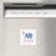 A feminine white kitchen magnet with your name is set below an image of a blue baby elephant dotted with colourful yellow, green, orange and purple flowers. The ear of the elephant is blueish grey and it has a black expressive eye. The baby elephant holds one purple balloon in its trunk. Your name personalises the design and is set with elegant purple font below the image.