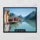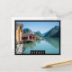 Postcard of a landscape with colourful yellow and red boathouses in the village of Fjaerland (Mundal) and mountains with reflection in the water of the fjord Fjaerlandsfjord, Sogn og Fjordane in Norway with a black edge and in a black box the text: 'Norway'.