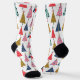 These cute Holiday themed socks have a repeating pattern of boho style Christmas trees in various colours and patterns. The images are placed on a white background. Festive, bright, and colourful!