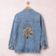 On the back of this denim jacket is a unique image of a rustic dreamcatcher with colourful boho style feathers.