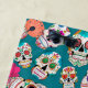 Bright images of sugar skulls make a colourful pattern on this unique personalised beach towel. There are several different skull images, all individual in various colours, and placed on a teal background. At the bottom is a matching teal banner with your custom text in white.