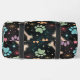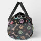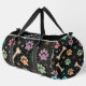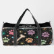 This colourful design duffel bag showcases vibrant paw prints and bones in lime green, pink, purple, orange, and white, interspersed with unique starburst elements on a dark background. It's a stylish pet-themed gear bag for any pet lover seeking fun design and practical storage.
