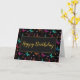 A bold vivid birthday card. Designed with an elegant pattern with graphic illustrations of butterflies in many bright colours, contrasting very nicely on the black background. Whimsical florals, sprigs and leaves add a bit of charm.
