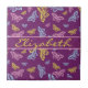 Butterflies in bright yellow, pink, and blue on a dark deep purple background. With a monogram banner to personalise and add any name.