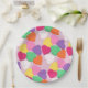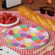 Pink, purple, yellow, orange and green candy hearts on a light pink background.
