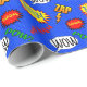 Fun colourful boy's super hero action words wrapping paper. A blue cartoon looking background, with yellow, green, red, and white words and action bubbles decorate this fun wrapping paper. Customise to add any additional text you want.