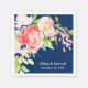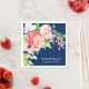 A bright and colourful floral and cattail bouquet is at the top left corner of these pretty wedding paper napkins. Colours in the bouquet include coral pink, light violet pink, white, pale yellow and gold, and green, with a touch of aqua blue. It features your custom text in white at the centre. The image is placed on a dramatic navy blue background. Your custom text is in white at the bottom. These pretty napkins are versatile enough to be used for a variety of events, especially in the spring and summer, or any event with a tropical theme. There are matching wedding invitations and other wedding products in our store.