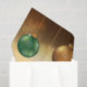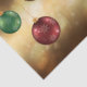 Destei's original illustration of different colour Christmas baubles on a beautiful bokeh background. There are green, red and golden yellow colour Christmas baubles in the design. The background is a lovely yellow and brown colour bokeh.