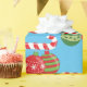 Pretty Christmas ornaments in green and red hand from a red & white striped candy cane, all against a bright and cheerful blue background.