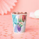Pretty paint pour design of three Christmas balls, is printed on paper cups. The Christmas balls are painted in a paint pour type design with a spray of a pine needle branch on the side. The colours in the design are shades of turquoise and teal, orange, purple, and pink. Thank you for shopping at CherylsArt on Zazzle.