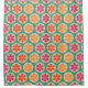 Colourful, fun patterned shower curtain features circles on a teal blue background with flowers of gold, orange, and deep rose.