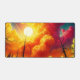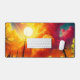 This desk mat has a colourful cloud design on it.