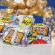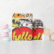 A vibrant comic-style pattern filled with colourful speech bubbles and pop art elements featuring words like hello, wow, cool, bam, and hi. The design uses bold shapes, halftone dots, lightning bolts, and stars, creating a fun retro comic book aesthetic perfect for playful prints and modern pop art themes.