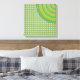 Customisable Colourful Concentric Circles Canvas with grey background below a second background of small tiled concentric circles an finally same concentric circle placed large, and cropped to reveal only one quarter of the circle, placed in the top right hand corner of the canvas. This canvas come as a set of four canvases, which together, will complete the large cropped circle.