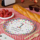Custom printed plates: a cute idea for baby's first birthday party! Featuring baby's name and a "1" in confetti, with fun colourful rainbow confetti circles sprinkled all around the edge of the plate.