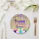 Personalised birthday paper plate design featuring colourful confetti and balloons on a old paper background. The text is fully customisable.