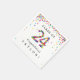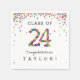 Custom printed napkins with rainbow colours for a graduation class of 2024. Featuring Class of "24" in confetti, and Congratulations to the Grad's Name with fun colourful confetti circles sprinkled all around the edge of the napkin.