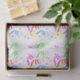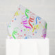 Colourful tissue wrapping paper with graphics of blue, red, green, yellow, and pink confetti and ribbons. Customise to add your own text.