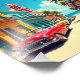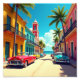 Step into the vibrant heart of Cuba with this stunning poster capturing a sun-soaked street scene full of life, colour, and nostalgia. Brightly painted colonial buildings in shades of yellow, pink, turquoise, and orange line a palm tree-dotted avenue leading straight to the sparkling Caribbean Sea.