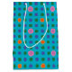A fun Medium Gift Bag, with Polka Dots of varying sizes in Pink, Orange, Blue and Green, on a White background that you can change if you wish (Turquoise shown). This pattern coordinates with the Posh and Painterly "Fish in the Sea" collection and can be adjusted to fit any Gift Bag.