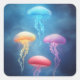 Dive into a dreamy underwater nightscape with this whimsical jellyfish sticker featuring four glowing jellyfriends drifting serenely through the deep sea. Each jellyfish is rendered in a radiant palette—cool cerulean blue, glowing sunset orange, gentle violet, and vibrant coral pink. Their delicate tendrils trail behind like wisps of underwater magic, glowing softly in the dark ocean currents. Together, they create a harmonious dance of colour and movement, like bioluminescent lanterns floating in the quiet mystery of the sea.
