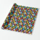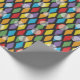 This wrapping paper has a stained glass-like vibe with diamonds of yellow, red, orange, blue, green, and purple with transparrent dots scattered across is all. Any gift would look bright and cheerfully given in this wrapping paper design.