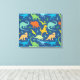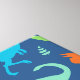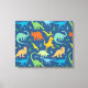 Colourful Dinosaur silhouette pattern. Tyrannosaurus Rex, titanosaurs, Triceratop, raptors, Ankylosaurs, Dino-Birds, Stegosaurus, Apatosaurus, Pteranodon and more in a colourful pattern in blue background, and dinosaurs in green, blue, yellow and orange.