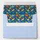 Colourful Dinosaur silhouette pattern. Tyrannosaurus Rex, titanosaurs, Triceratop, raptors, Ankylosaurs, Dino-Birds, Stegosaurus, Apatosaurus, Pteranodon and more in a colourful pattern in blue background, and dinosaurs in green, blue, yellow and orange.
