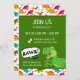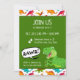 Does your little boy or girl love dinosaurs? This custom birthday party invitation is perfect! There's a big T-Rex saying RAWR, dinosaur footprints and your little kid's name on white, a green background, and a fun colourful dino pattern.