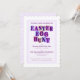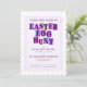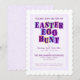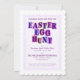 Colourful invitation with each letter of "Easter Egg Hunt" on it's own colour background pennant or swatch, set within a speckled purple border with the same speckled purple pattern covering the back of the card.