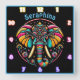 A majestic elephant richly decorated with intricate patterns and bright colours stands proudly amidst whimsical elements, radiating joy and elegance in a playful celebration of life.