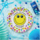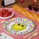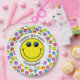 A yellow face sits in the centre of this plate with sample text "Happy Birthday" above and the name "Christopher" below for you to personalise. Background is a white circle with a border of colourful faces in pink, orange, yellow, green, blue and purple. Great for birthday parties or other special occasion.