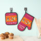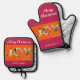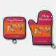 Bring colourful festive cheer to your kitchen with this eye-catching oven glove and pot holder set. The design is bright pink and orange, with 'Joy to the world' in the centre. The word 'Joy' is infilled with a botanical green leaf and red poinsettia flower design. At the top, is the classic 'Merry Christmas' greeting in festive script typography. Personalise with your family name(s), business name or other text for that extra individual touch. An ideal holiday gift for kitchen and home.